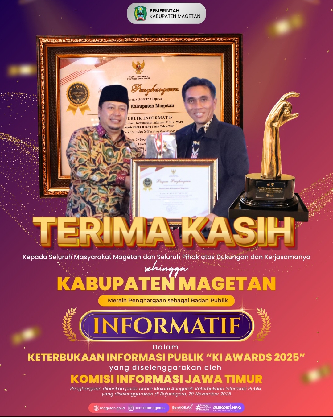 “Kami mengucapkan terima kasih kepada seluruh masyarakat Magetan dan seluruh pihak atas dukungan, kepercayaan, serta kerjasama yang selama ini terjalin. Penghargaan ini adalah milik kita semua. Komitmen bersama dalam menyediakan informasi yang terbuka, akurat, dan mudah diakses menjadi kunci utama keberhasilan Magetan meraih predikat sebagai Badan Publik Informatif,” ujar Cahaya Wijaya.