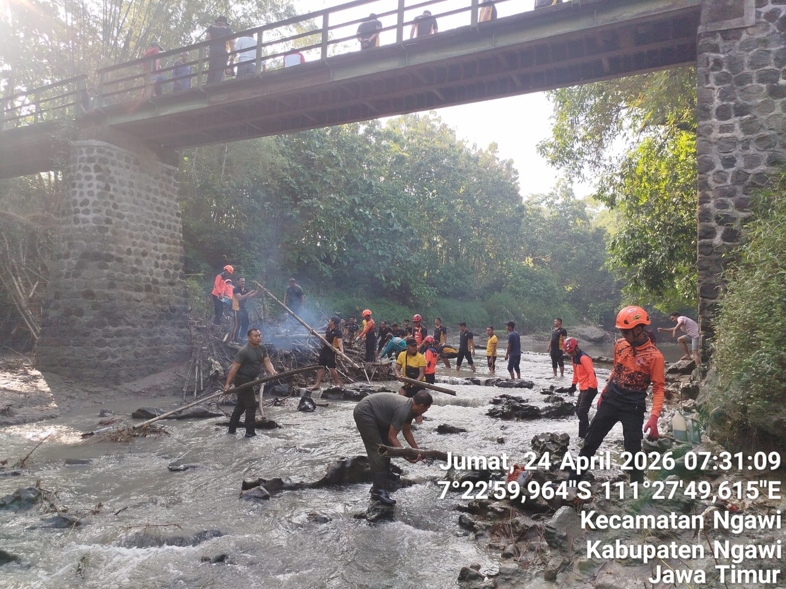 Ngawi, indonesia-jaya.com– Wujud kepedulian terhadap lingkungan ditunjukkan oleh berbagai unsur di Kecamatan Ngawi Kota melalui kegiatan kerja bakti pembersihan sungai yang dilaksanakan di Dusun Blandongan, Desa Ngawi, Kec. Ngawi, Kabupaten Ngawi. Kegiatan ini melibatkan anggota Koramil 01 Ngawi, Polres Ngawi, Badan Penanggulangan Bencana Daerah (BPBD), serta masyarakat setempat. Jum’at (24/4/2026).
