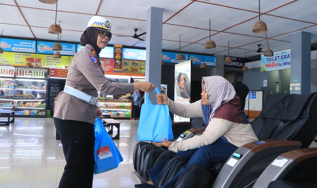 Kali ini, Wakapolres Ngawi Kompol Rizki Santoso, S.I.K., bersama Polisi Wanita (Polwan) Polres Ngawi membagikan bingkisan kepada para pemudik yang sedang beristirahat di Rest Area KM 575A.