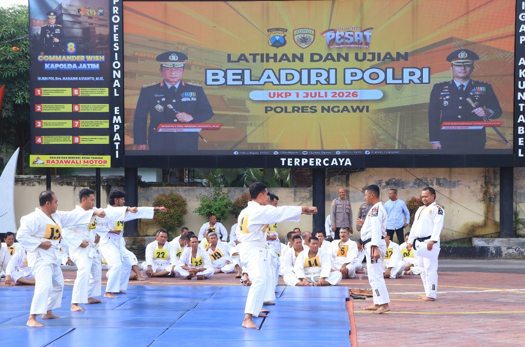 Ngawi, indonesia-jaya.com– Polres Ngawi melaksanakan ujian Beladiri Polri sebagai salah satu syarat administrasi dan kompetensi dalam rangka kenaikan pangkat personel periode 1 Juli 2026. Kegiatan tersebut diikuti oleh personel Polres Ngawi yang memenuhi persyaratan dan digelar dengan pengawasan ketat sesuai ketentuan yang berlaku.