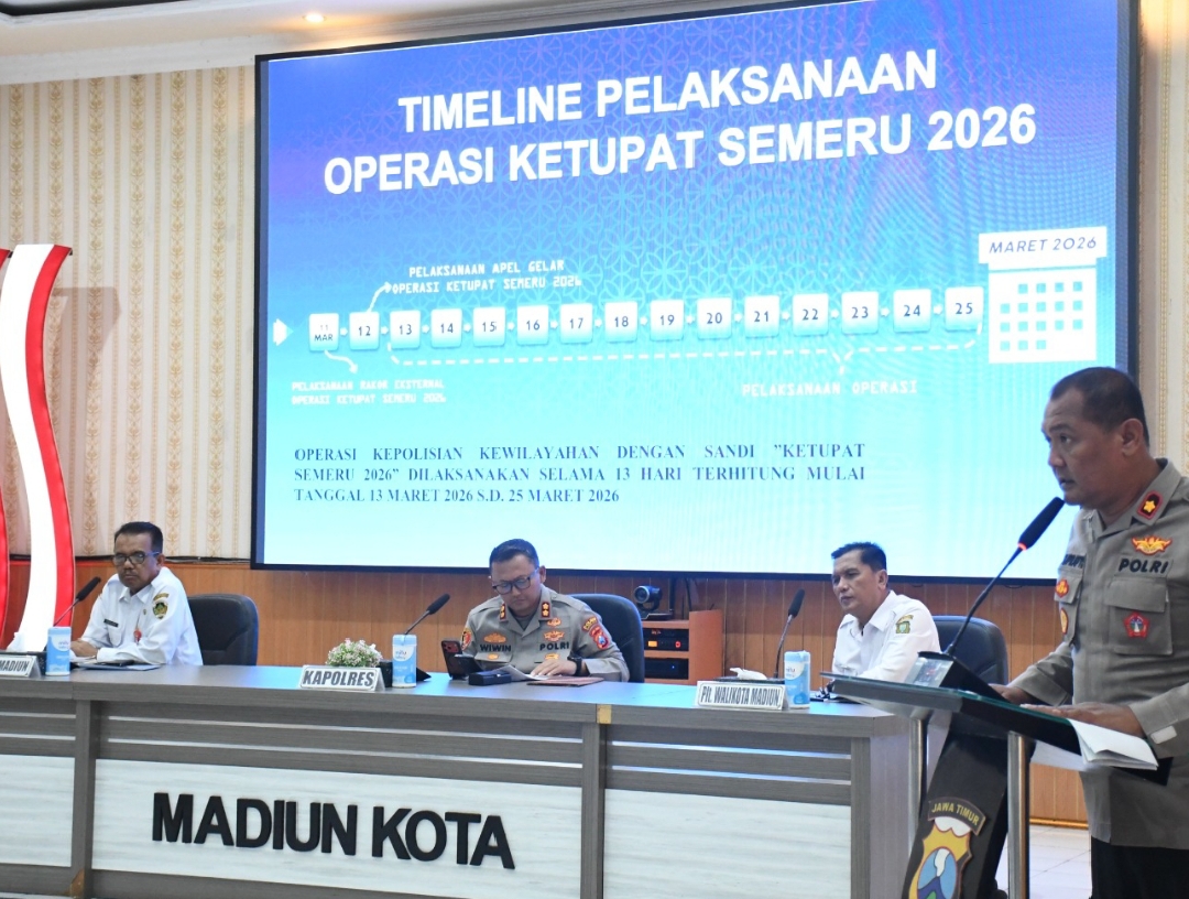 Kota Madiun, indonesia-jaya.com– Polres Madiun Kota menggelar Rapat Koordinasi (Rakord) Lintas Sektoral Operasi Ketupat Semeru 2026 yang berlangsung di Gedung Sunaryo Polres Madiun Kota, Rabu (11/3/2026). Kegiatan tersebut dipimpin langsung oleh Kapolres Madiun Kota AKBP Wiwin Junianto, S.I.K. serta dihadiri unsur TNI, pemerintah daerah, instansi terkait, dan para stakeholder lainnya.