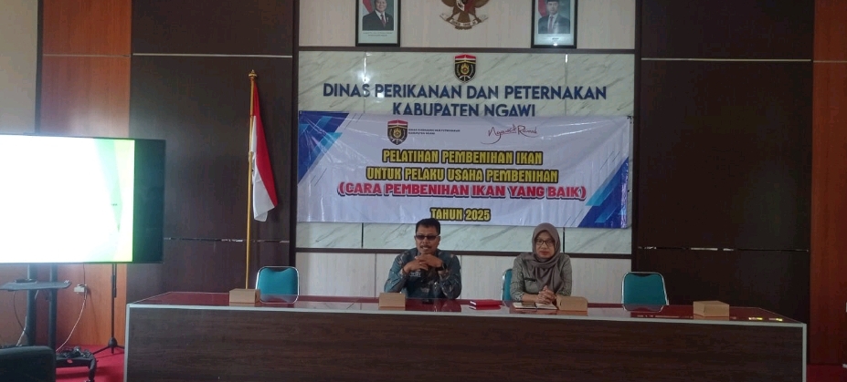 Ngawi, indonesia-jaya.com-29 Agustus 2025 – Dalam upaya meningkatkan kapasitas sumber daya manusia di sektor perikanan, Dinas Perikanan dan Peternakan Kabupaten Ngawi menyelenggarakan Pelatihan Pembenihan Ikan untuk Pelaku Usaha Pembenihan dengan Standar CPIB (Cara Pembenihan Ikan yang Baik). Kegiatan ini berlangsung pada hari Kamis, 29 Agustus 2025 di Aula Dinas Perikanan dan Peternakan Kabupaten Ngawi, dengan diikuti oleh 38 peserta dari kalangan pembudidaya ikan kecil di wilayah tersebut.